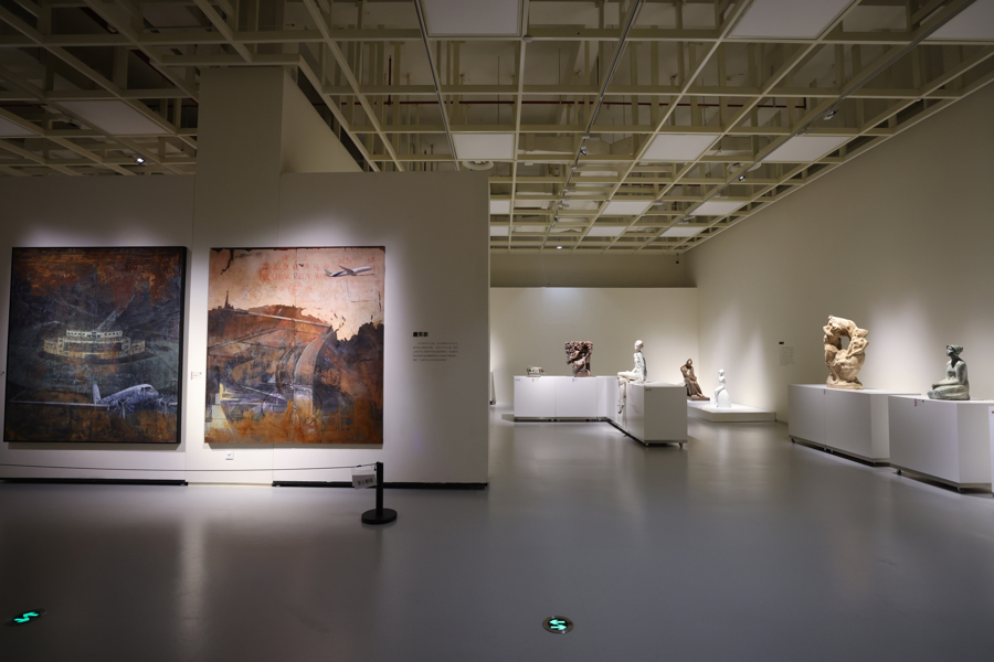 例如,吴慧明以玻璃钢材质的雕塑赞美劳动者,彰显出诗性美学风格。李传真关注务工群体,结合素描与传统工笔线条,捕捉温情瞬间。沙永汇以宏大木刻聚焦时代建设,再与精细化的抽象造型相结合,最终赋予画面强烈的视觉冲击与心灵共鸣。张弛以略带抽象化的处理和色彩运用表现当代城市的生机盎然、蓬勃向上,为山水画注入新意……从中,观众能够感受到创作者以笔为媒,以情为核,将“小我”融入“大我”,展现出女性艺术家群体的共同价值追求和个性表达。